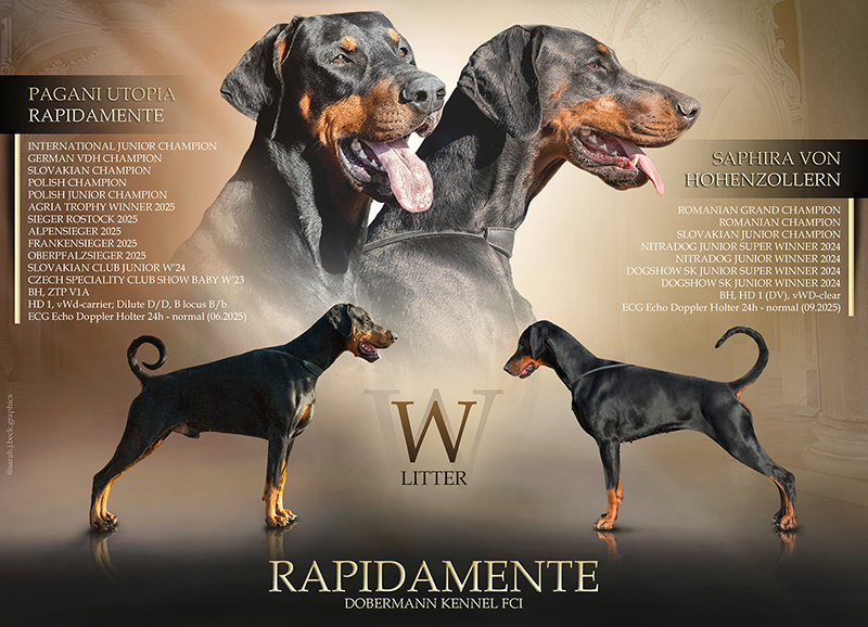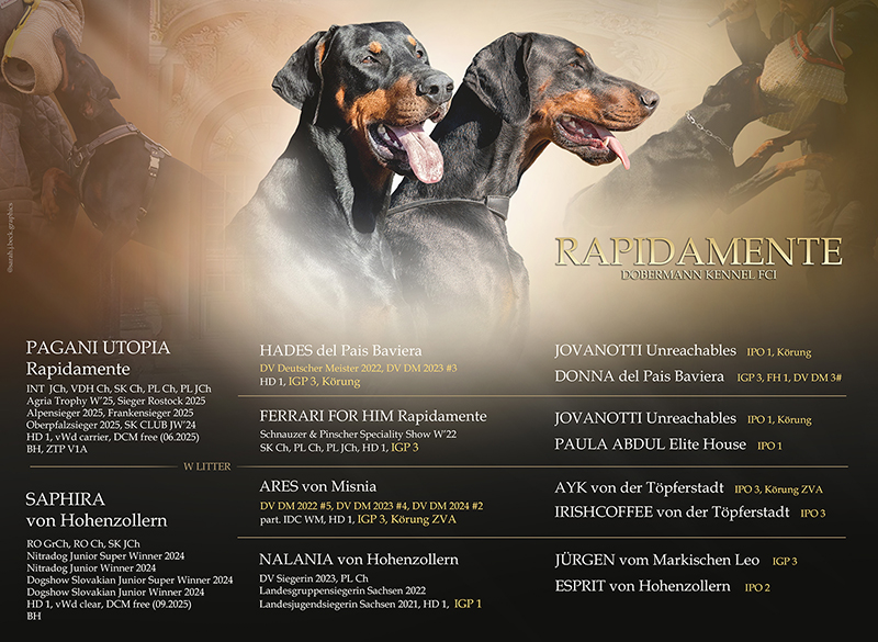 We do have Dobermann puppies. This great combination is promising for dog sport and dog shows. Pagani Utopia Rapidamente (2-2 Jovanotti Unreachables, IGP 1, Körung) is the son of my great Ferrari For Him Rapidamente (IGP 3). The dam is our newcomer Saphira von Hohenzollern. Saphira's father is Ares von Misnia (Körung ZVA Ia, IGP 3, 5# DV DM 2022, 4# DV DM 2023, 2# DV DM 2024, part. IDC WM 2022+2024+2025, part. VDH WM 2024). Saphira's mother is DV Sieger Nalania von Hohenzollern (IGP 1). All dogs in 2nd and 3rd generation are titled in IGP / IPO ... 7 of them even IGP / IPO 3.